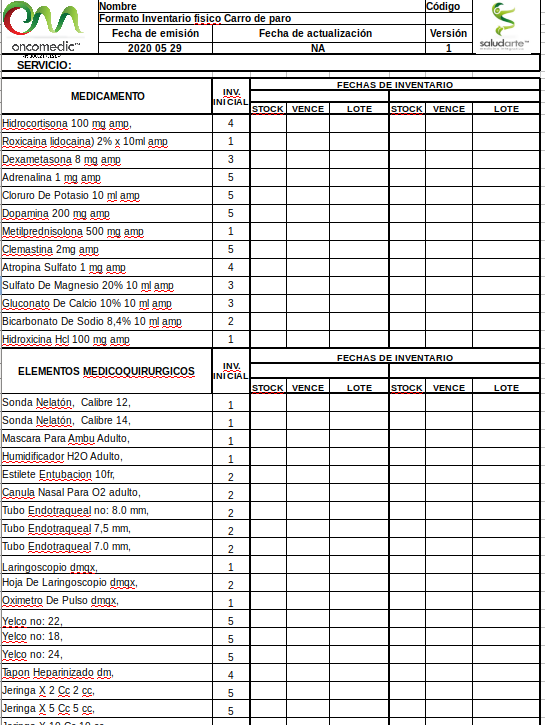El presente documento constituye la guía para la correcta gestión del Carro de paro en Oncomedic Ltda, incluye el manejo del stock, sus controles y usos |
