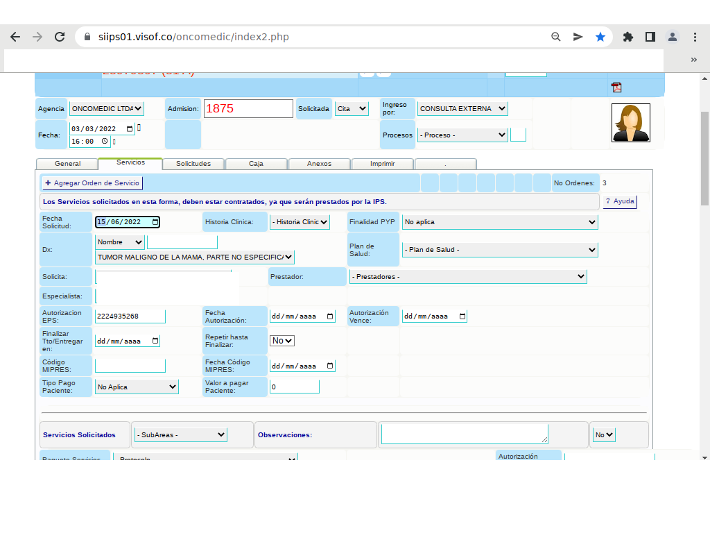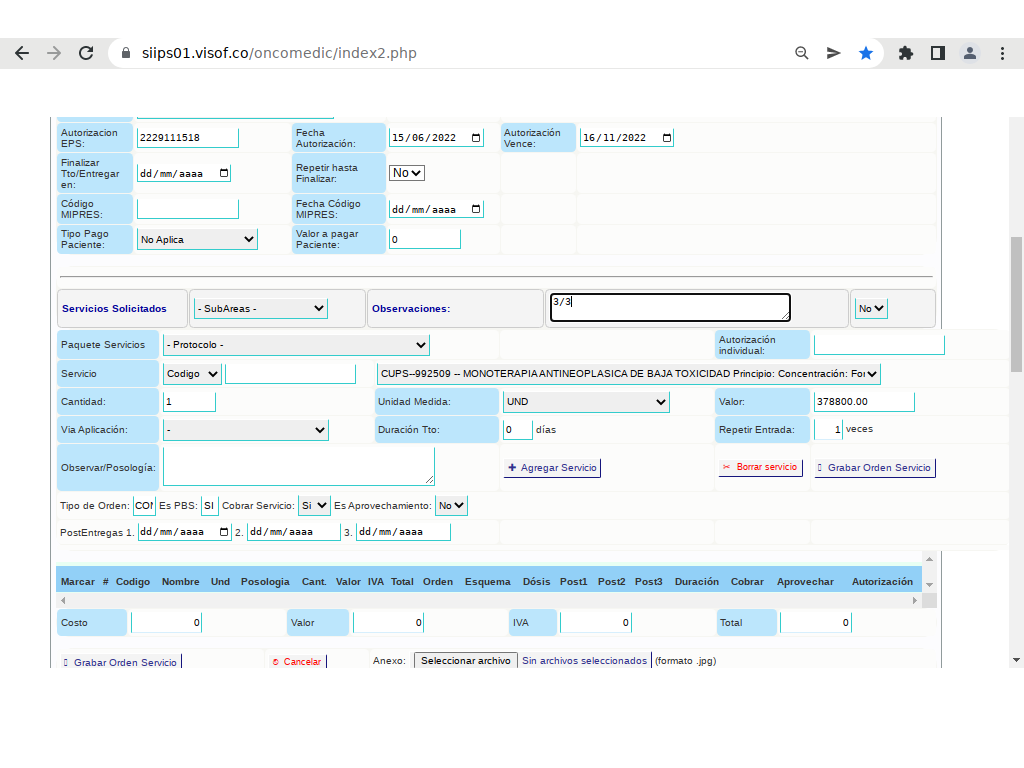 • En el campo “observaciones”, colocamos el número de servicio ordenado (ejemplo; si se ordenaron 3 monoterapias se coloca 3)