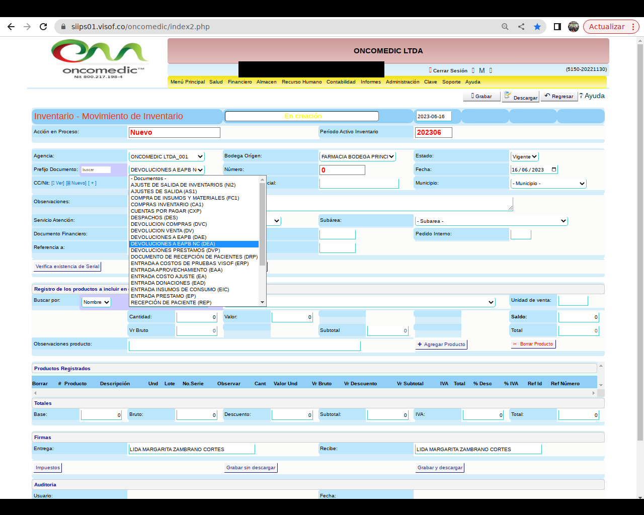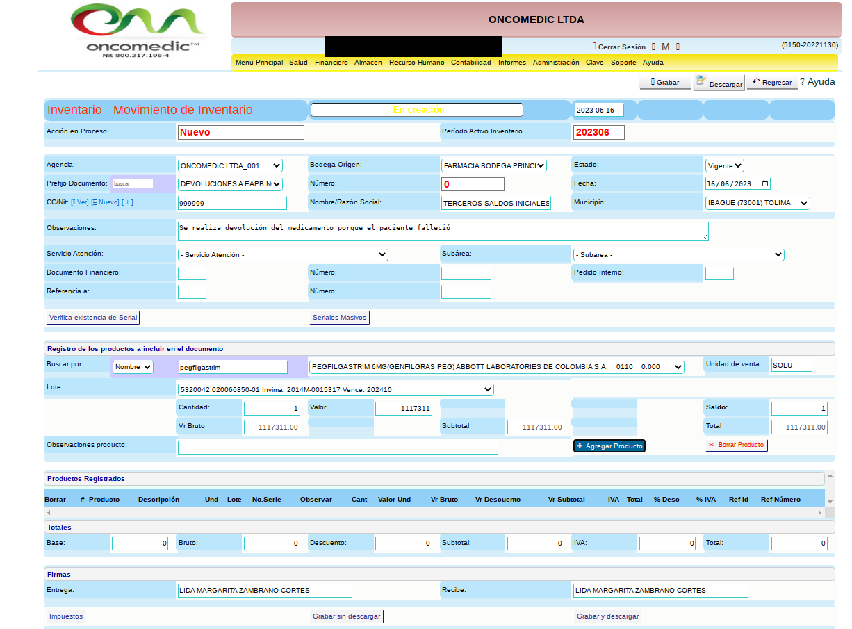 -Luego de verificar que la información de los medicamentos a devolver sea la indicada dar clic en grabar.