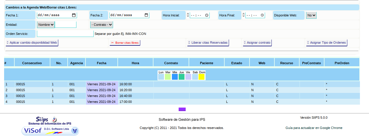 En la parte inferior de la imagen se evidencia la agenda creada, es factible realizar modificaciones en el apartado Cambios a la Agenda Web/Borrar citas Libres: