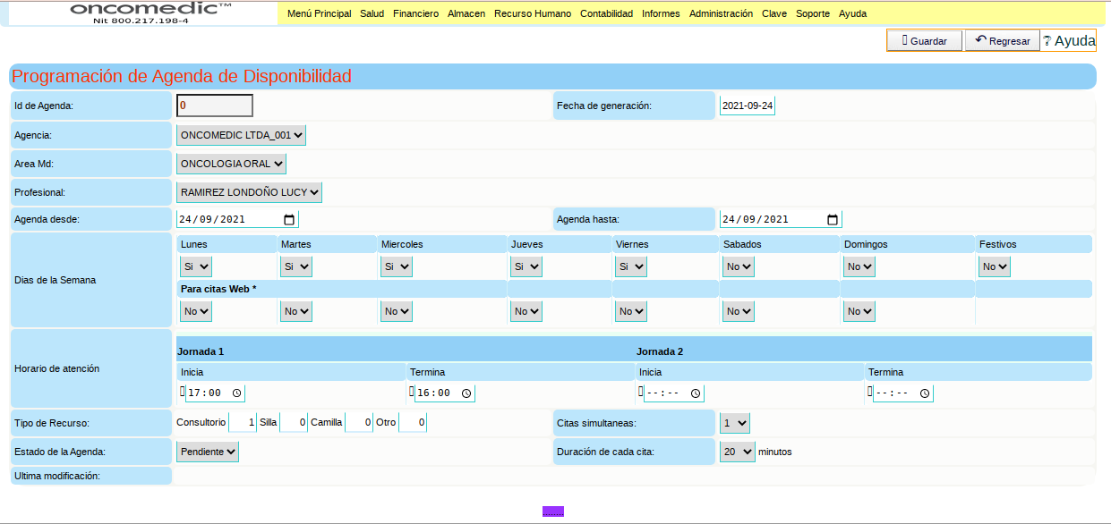 Los estados de las agendas son: V Vigentes, la agenda está vigente y disponible para ser utilizada P Pendiente, la agenda no se ha generado (Generar Real) o hay una agenda ya creada para un día A Anulada solo se permite anular cuando no hay citas vinculadas.