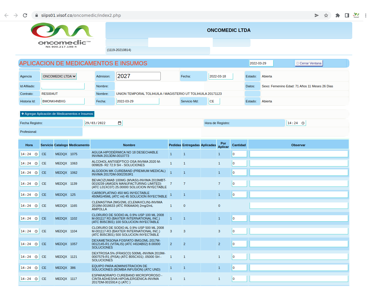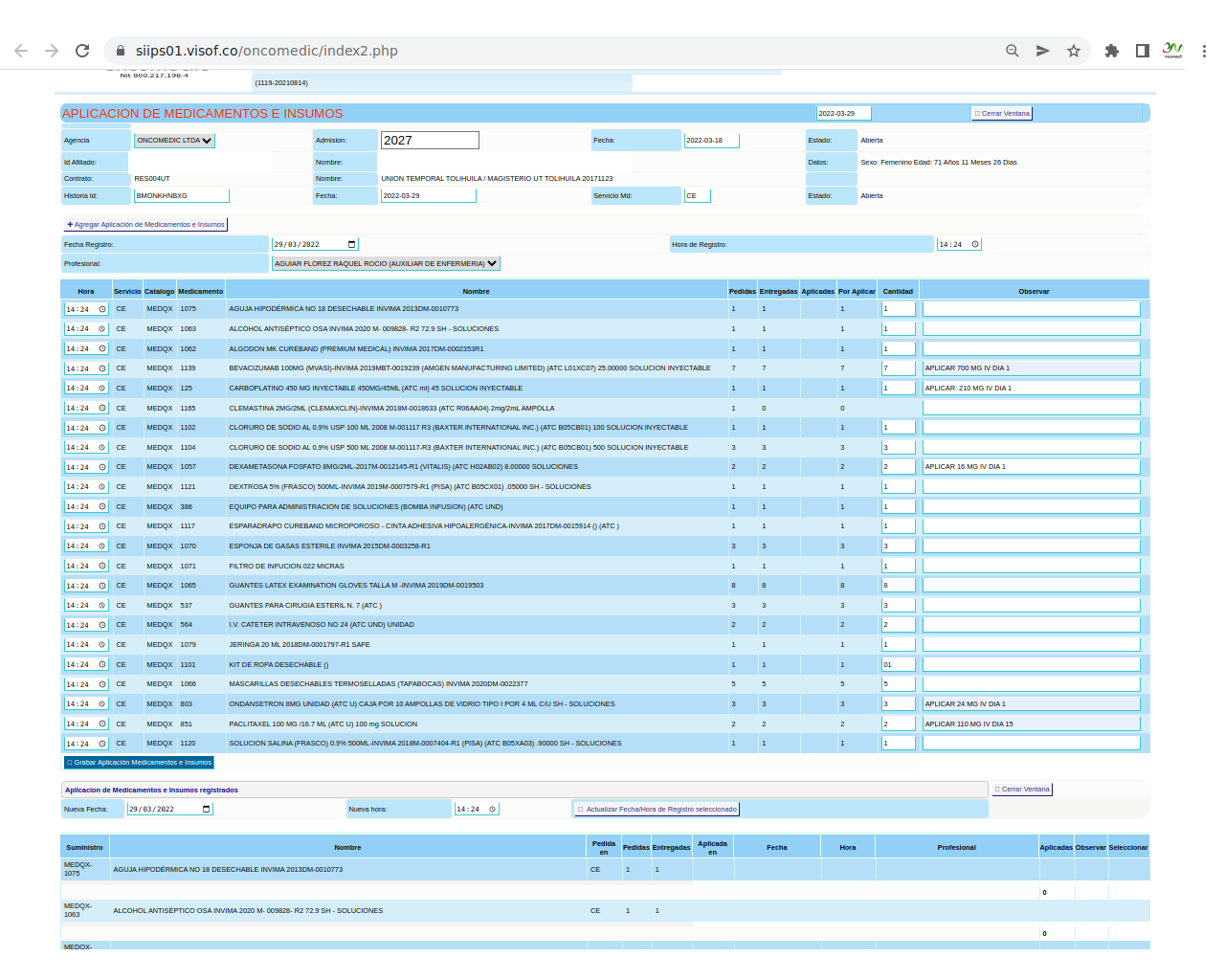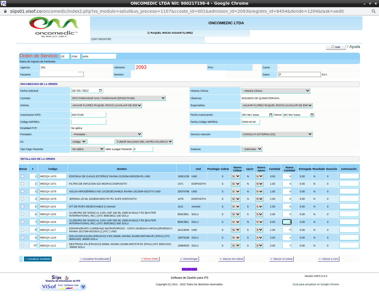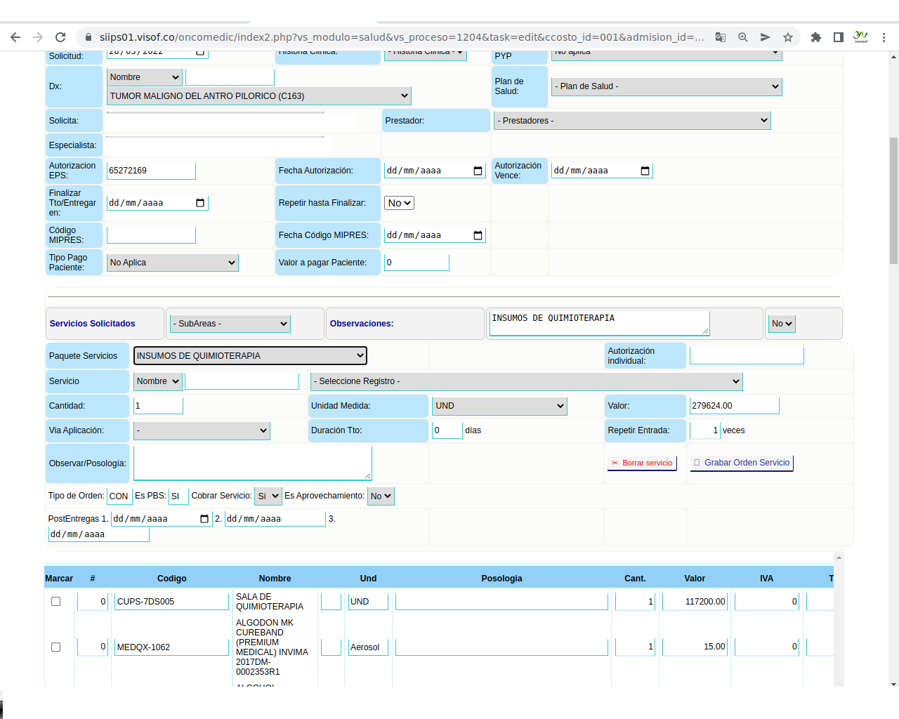 Solicitud de insumos para aplicación de quimioterapia: La solicitud se realiza el día de la aplicación del paciente y se hace de acuerdo a los pacientes programados y las características de la aplicación que se va a realizar, en este sentido, enfermera ya tiene unos paquetes de servicios parametrizados en visof.
