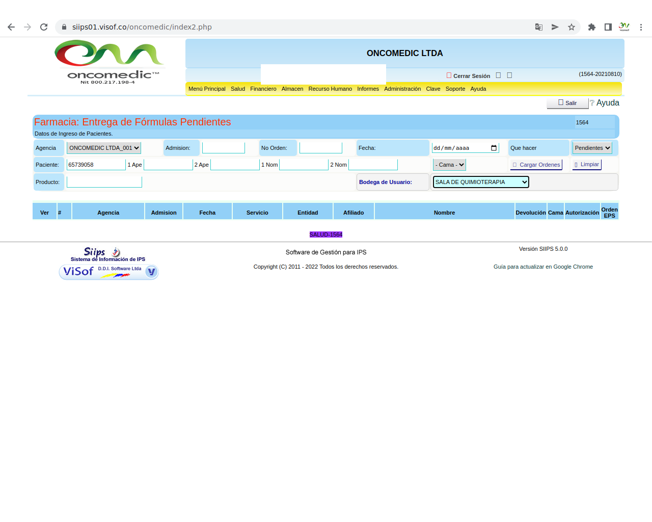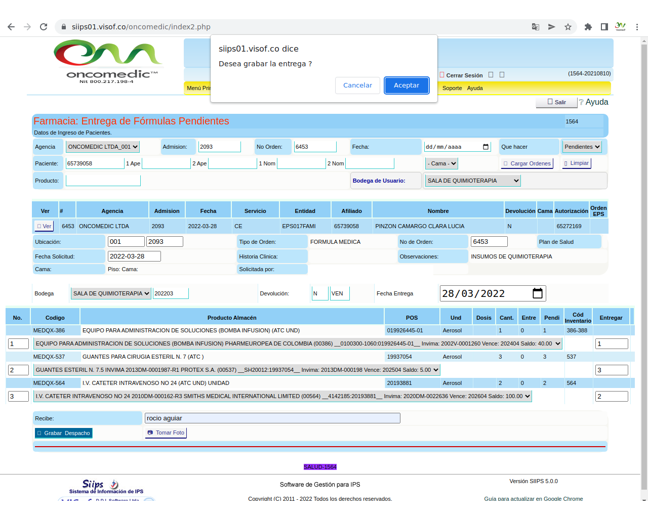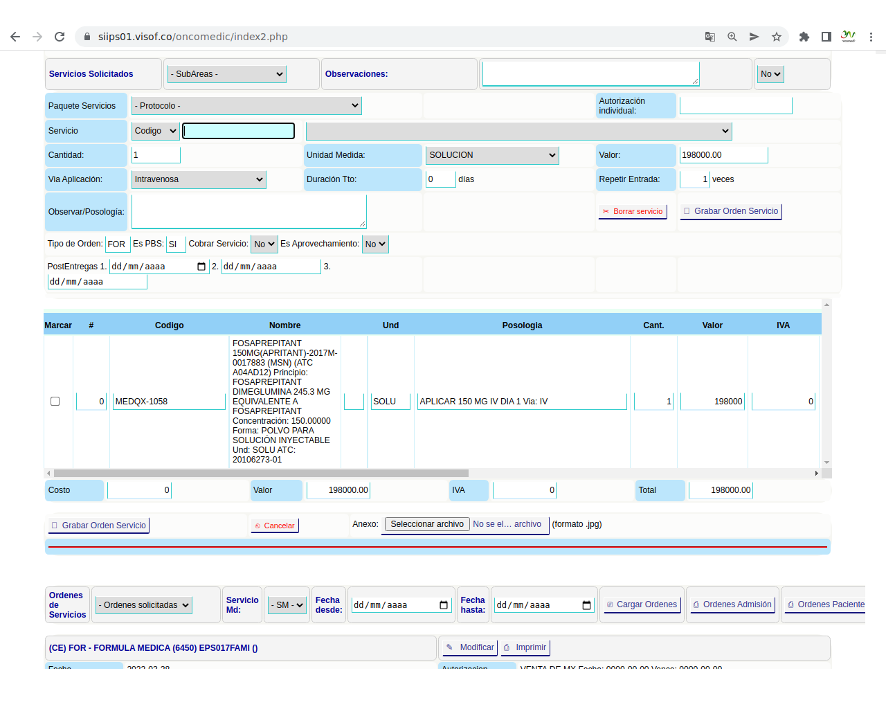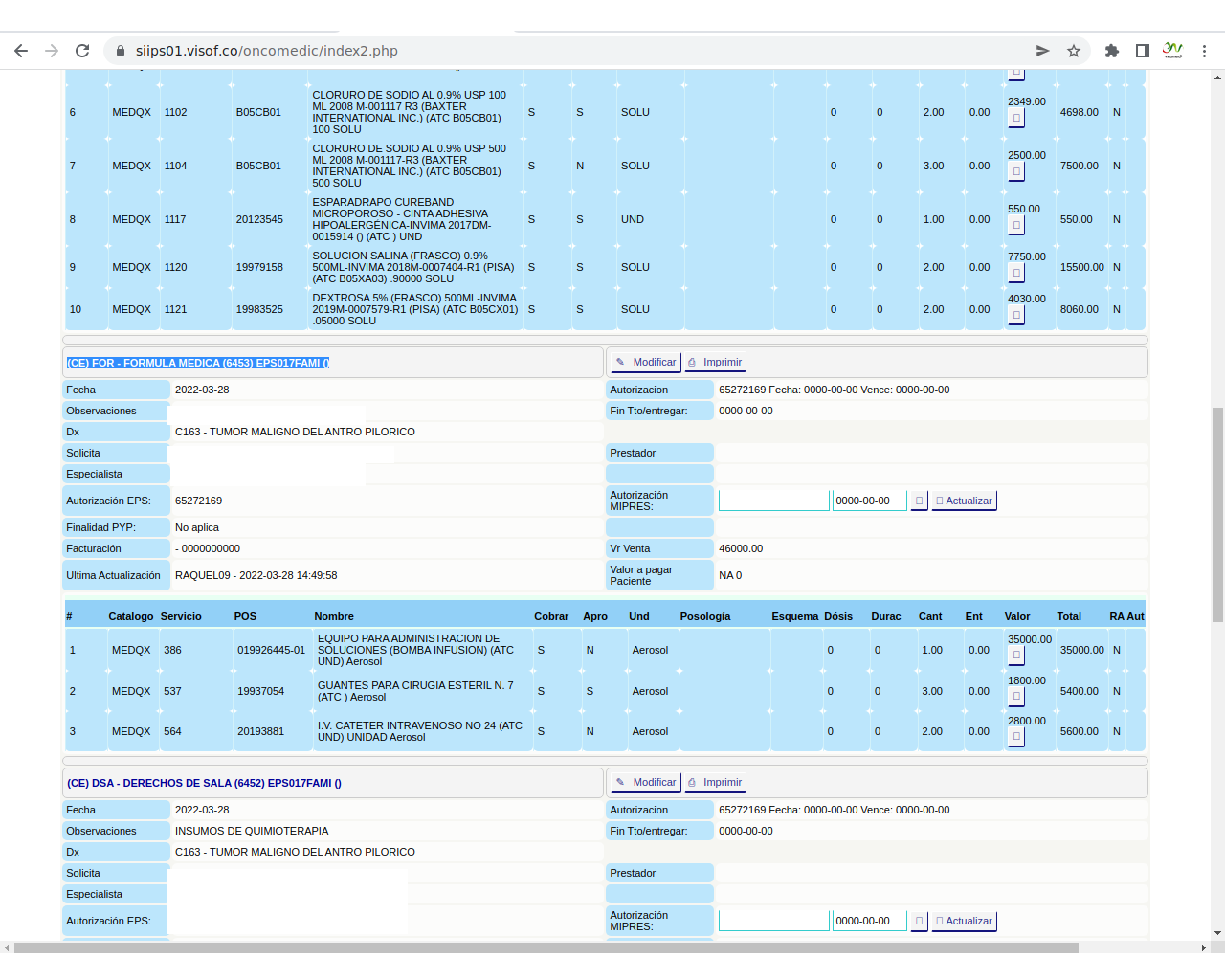 Solicitud de insumos para aplicación de quimioterapia: La solicitud se realiza el día de la aplicación del paciente y se hace de acuerdo a los pacientes programados y las características de la aplicación que se va a realizar, en este sentido, enfermera ya tiene unos paquetes de servicios parametrizados en visof.