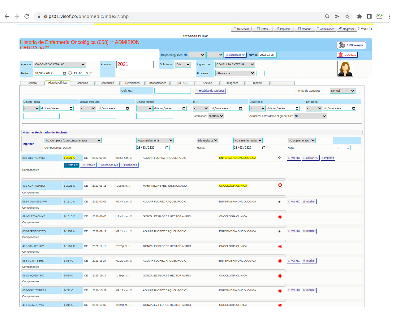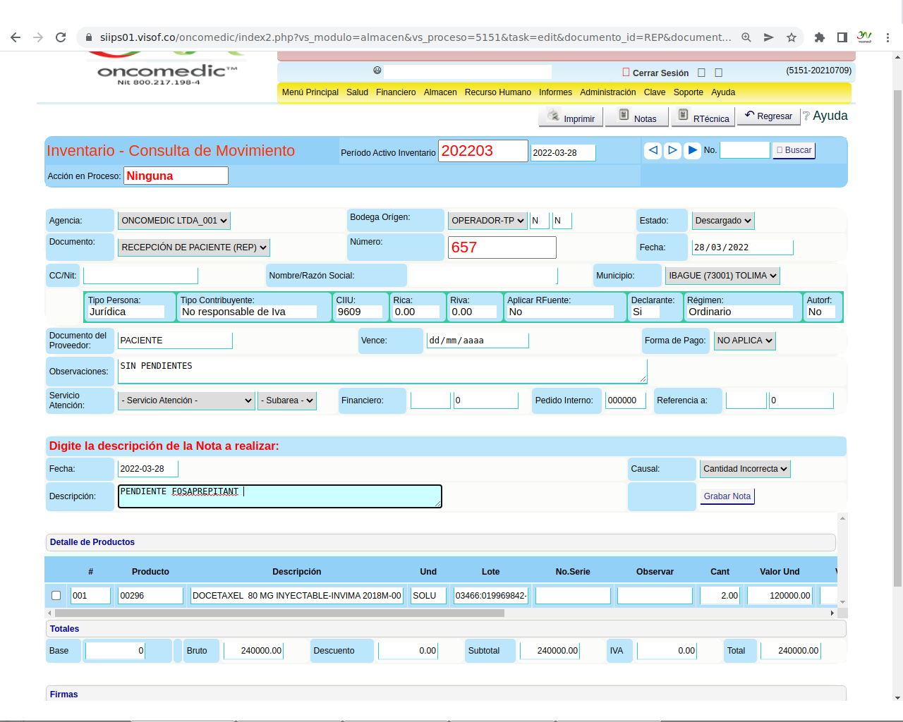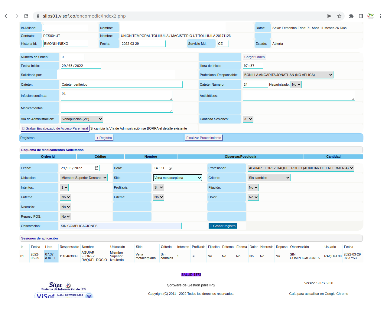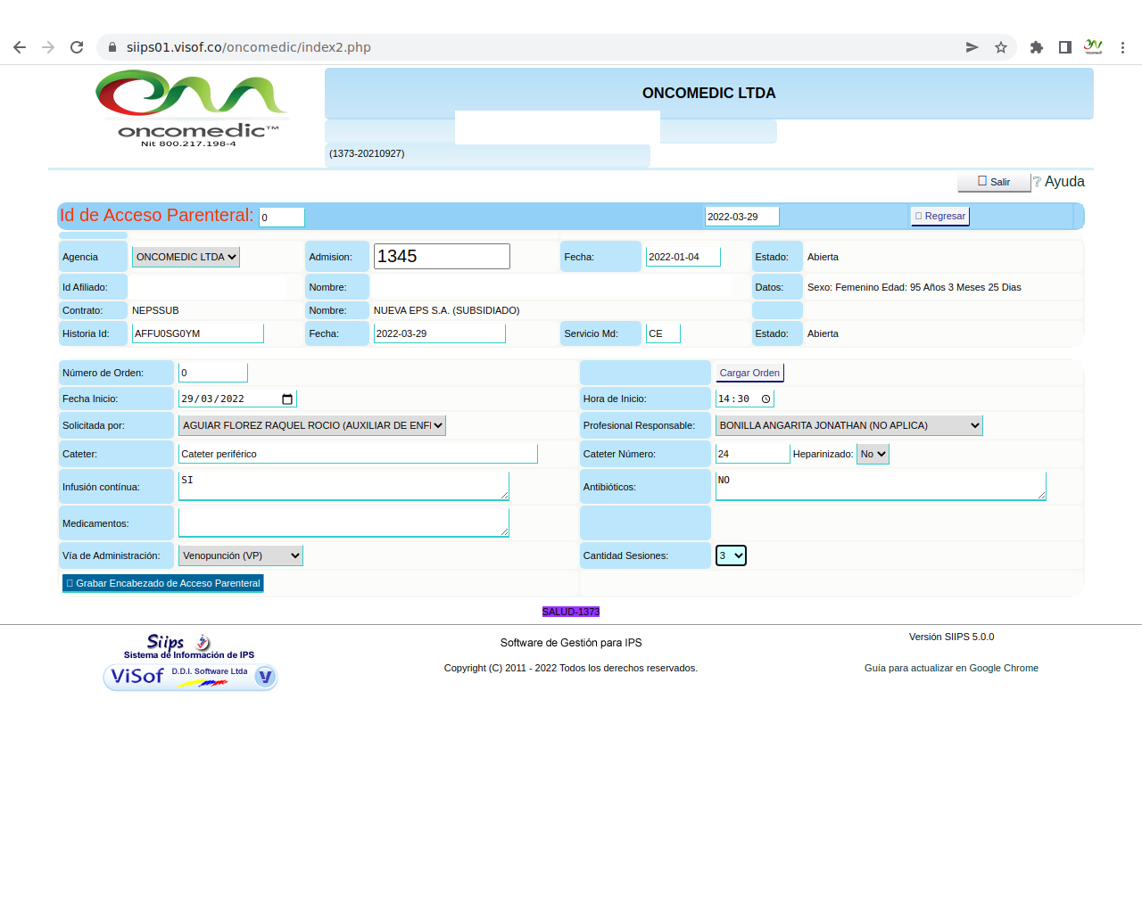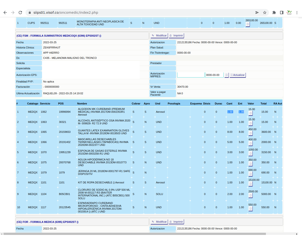 Solicitud de insumos para aplicación de quimioterapia: La solicitud se realiza el día de la aplicación del paciente y se hace de acuerdo a los pacientes programados y las características de la aplicación que se va a realizar, en este sentido, enfermera ya tiene unos paquetes de servicios parametrizados en visof.