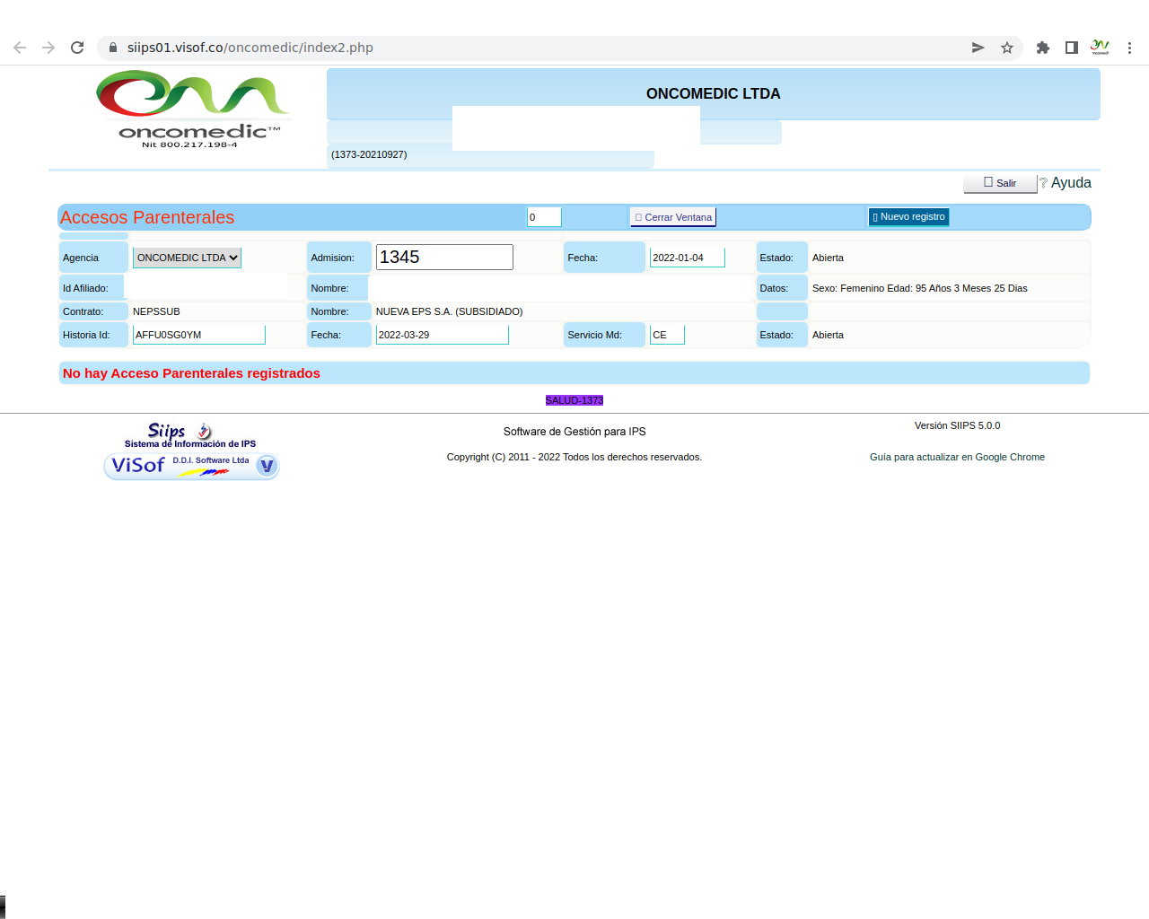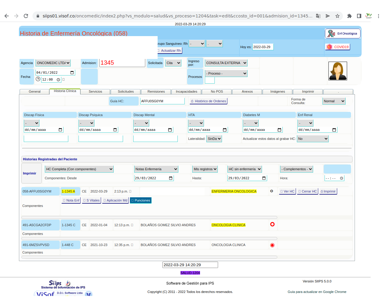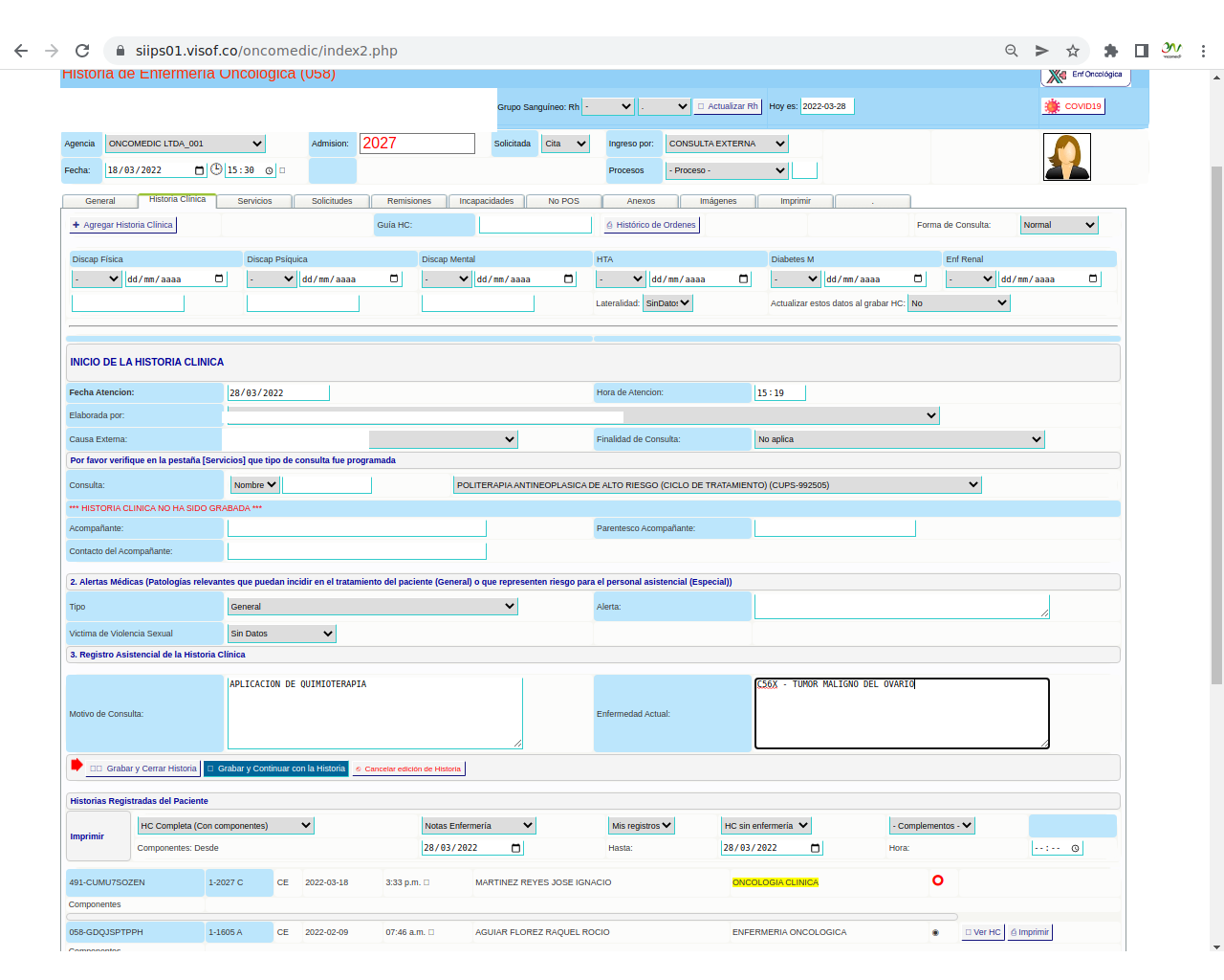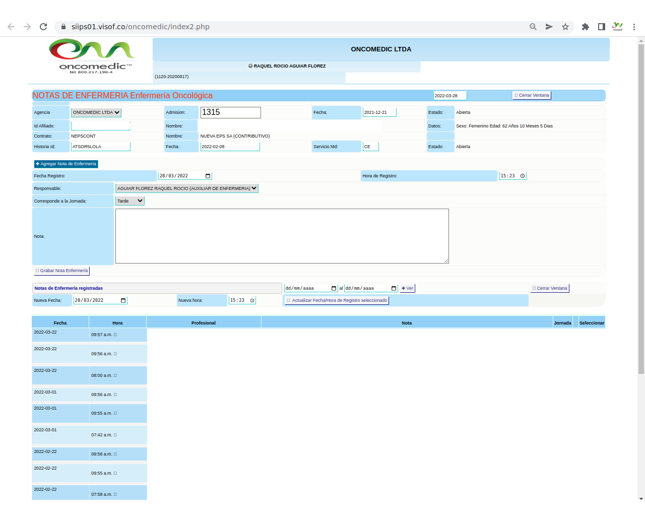 Solicitud de insumos para aplicación de quimioterapia: La solicitud se realiza el día de la aplicación del paciente y se hace de acuerdo a los pacientes programados y las características de la aplicación que se va a realizar, en este sentido, enfermera ya tiene unos paquetes de servicios parametrizados en visof.