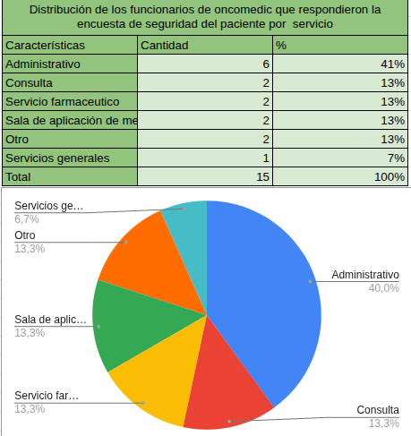 • Información general de los encuestados: incluye 5 preguntas que permite describir algunas características relevantes de la las personas que resolvieron la encuesta, como el area o servicio en que se desempeña. Del total de 15, 6 es decir 41% de los encuestados corresponde a personal administrativo, se incluyo en esta a los directivos y al personal de linea de frente con el objetivo de evaluar la percepción de seguridad en los diferentes niveles de la organización, se incluyo personal misional con 2 funcionarios encargados del servicio de consulta (13%), 2(13%) del Servicio farmacéutico, igual proporción para personal de Sala de aplicación de medicamentos, y Otros. 1 funcionario (7%) de servicios generales.