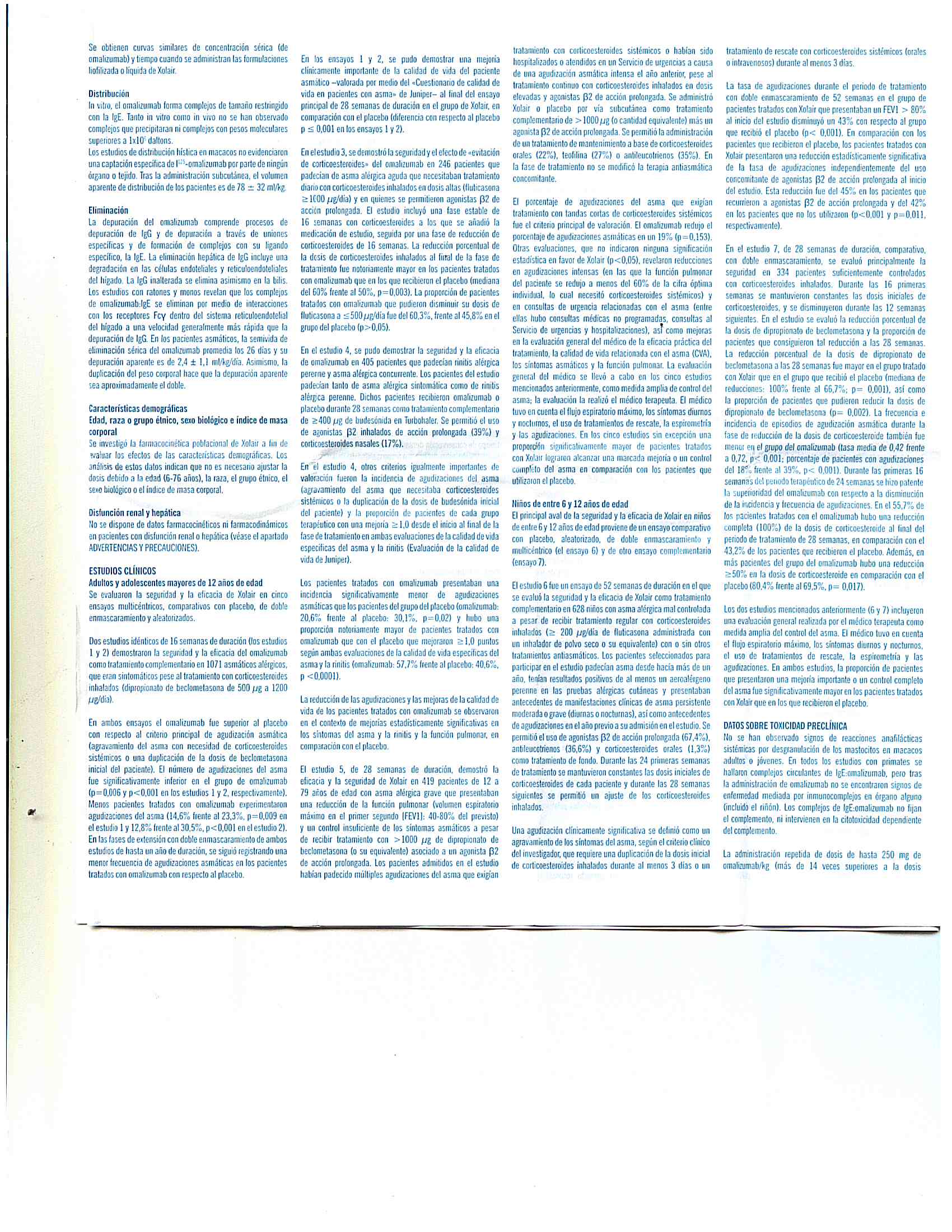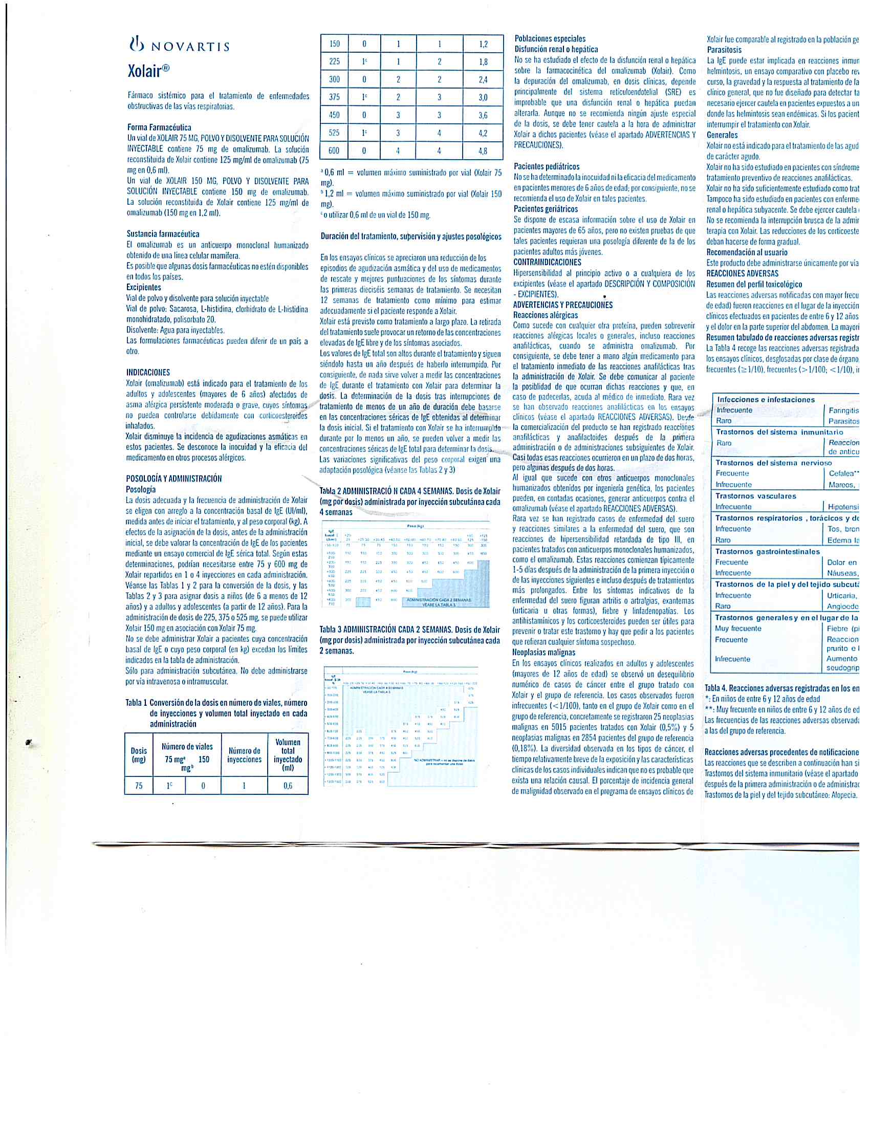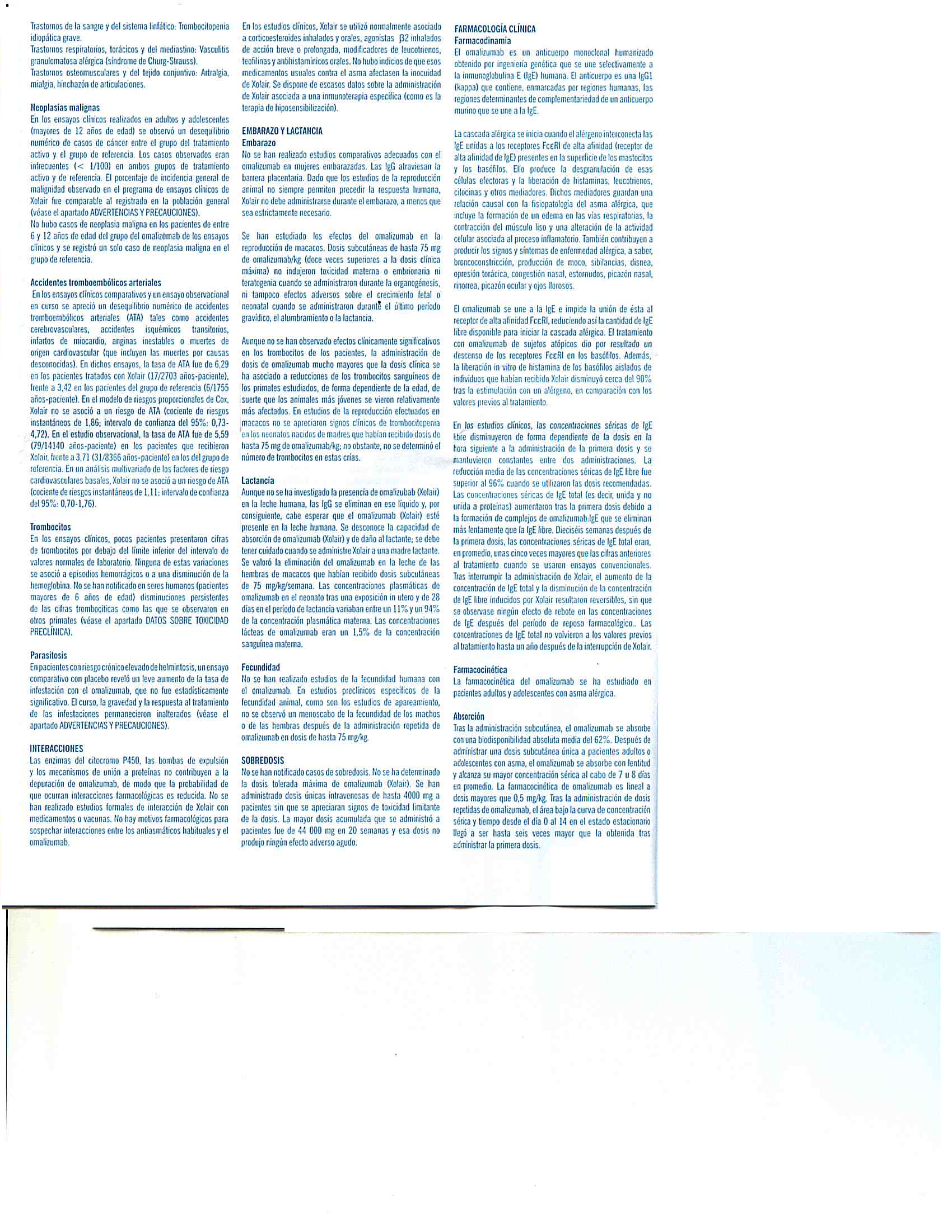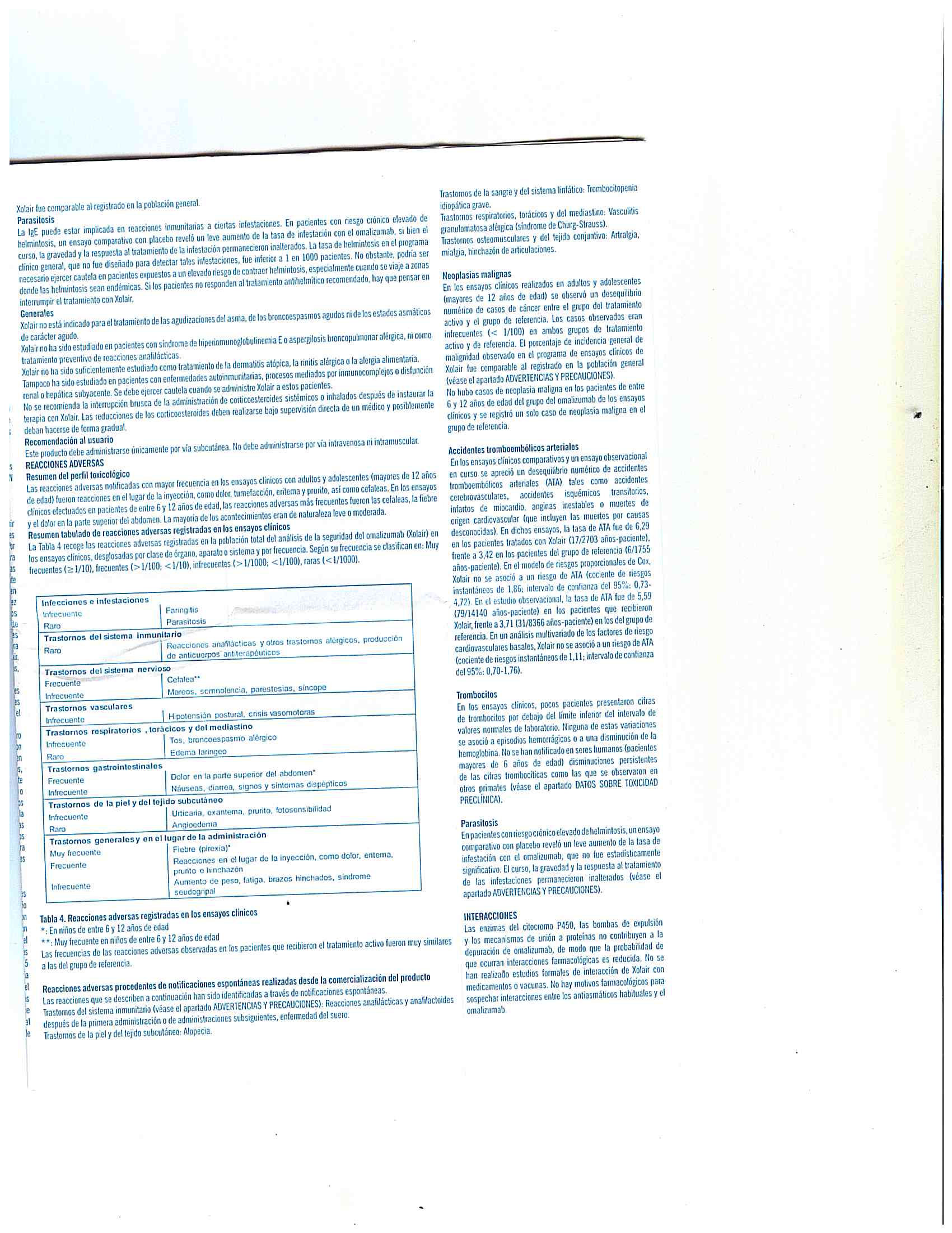 - Rara vez se observaron reacciones anafilácticas en los ensayos clínicos, pueden producirse reacciones alérgicas tipo I locales o sistémicas, incluyendo anafilaxia y shock anafiláctico durante el tratamiento con omalizumab, incluso con inicio tras un tratamiento de larga duración. La mayoría de estas reacciones se produjeron durante las 2 horas posteriores a la primera y siguientes inyecciones de Xolair, pero algunas se iniciaron pasadas las 2 horas e incluso pasadas 24 horas tras la inyección. Por lo tanto, se deberán tener siempre disponibles medicamentos para el tratamiento inmediato de reacciones e informar al paciente de que estas reacciones son posibles y que si se producen deberán solicitar atención médica de inmediato.