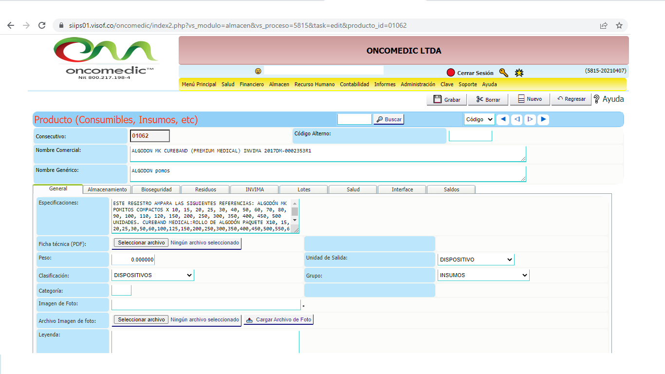 Nota: a todos los productos se les debe realizar la respectiva recepción técnica, de lo contrario no se puede realizar el cierre del periodo de inventario al finalizar el mes. Es necesario aclarar que al realizar la recepción técnica de estos insumos se genera el movimiento de ingreso en el inventario de almacén.