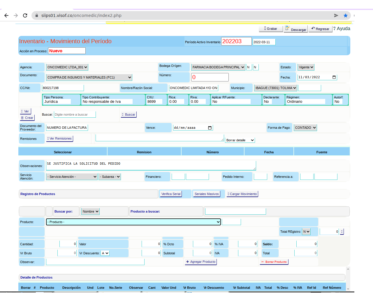 • Diligenciar los campos de cantidad y valor de acuerdo a las cantidades adquiridas y el costo del producto.