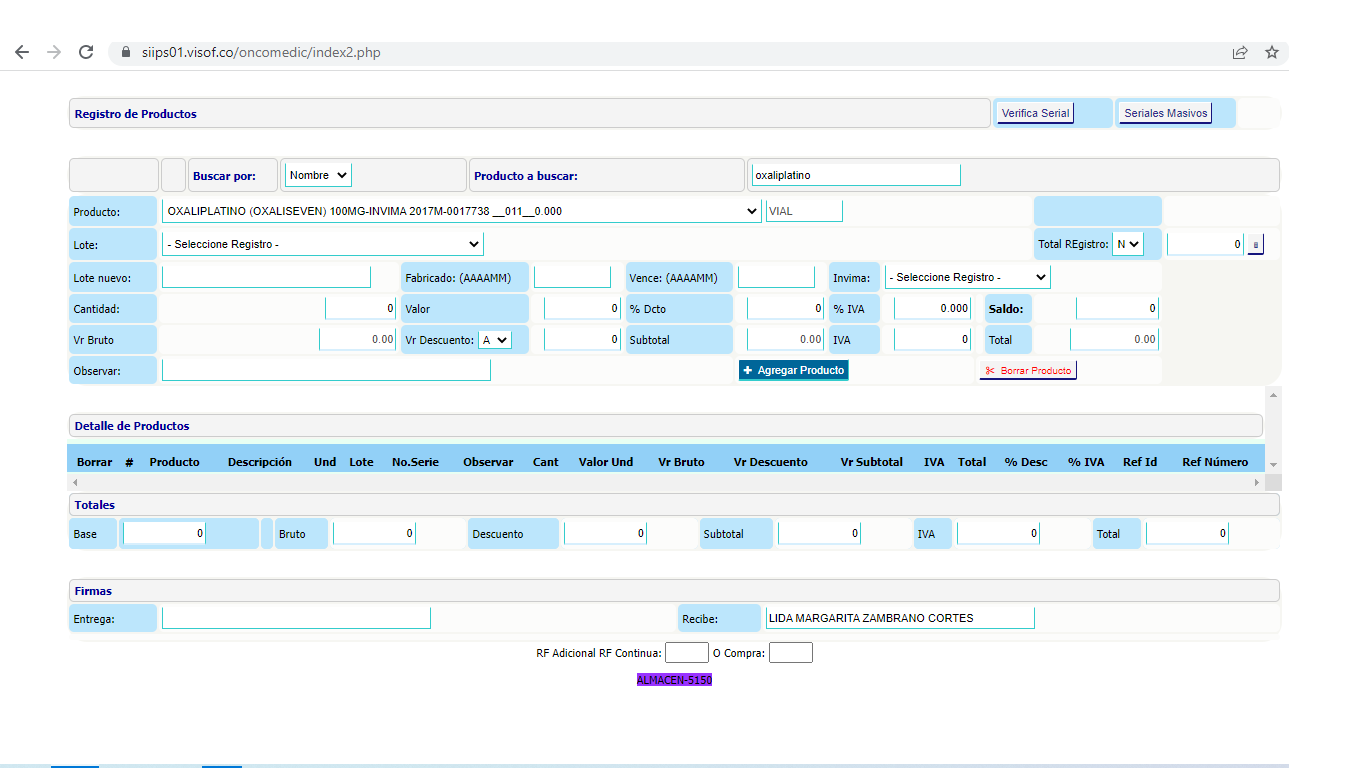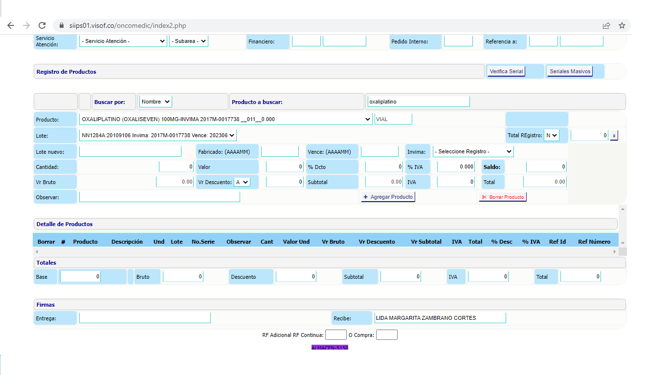 • En el campo “lote” se selecciona uno usado de lo contrario crear lote nuevo (de la misma manera que se crea en la recepción técnica del medicamento).