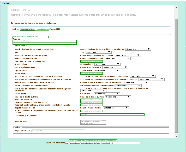 Cuando se detecta un incidente adverso a un dispositivo médico este es registrado en el Formulario de Eventos Adversos (Número 45 en el sistema Oncolinux 2). Cabe aclarar que este formulario es usado para reportar cualquier evento relacionado con la seguridad del paciente y no es exclusivo para el reporte de eventos relacionados con dispositivos médicos.