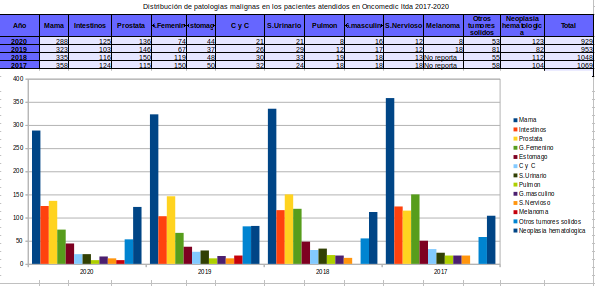 Cuando hablamos de la enfermedad neoplásica tratada en Oncomedic vemos una disminución en el numero de casos en 2017 vimos 1069 pacientes con enfermedades neoplásicas mientras en el 2020 fueron 929, si vemos la distribución de las patologías, 1. Ca de mama sigue siendo la mas frecuente en 2020 se presentaron 388 casos que corresponden al 31% de los pacientes con patología malignas vistos en este año. 2. El segundo mas frecuente continua siendo el ca de próstata con 136 casos que corresponde al 15% de la población vista en nuestra institución en el periodo estudiado. 3. El tercer lugar fue para tumores de intestino 125 casos que corresponden al 14%, 4. Las neoplasias hematológicas fueron agrupadas y se contabilizaron en total 123 casos que representan el 13%, 5. Las enfermedades ginecológicas se evidenciaron en 74 usuarias que representan el 8%. 6. 44 pacientes con ca de estomago fueron vistos en Oncomedic en 2020 corresponden al 5% de la población atendida 7. 21 sistema urinario 2% 8. 21 de cabeza y cuello 2% 9. 8 melanomas que representa menos del 1% de los casos 10. 16 G masculinos 2% 11. 12 SNC 1% 12. 81 corresponden a diversas localizaciones de tumores corresponde al 12%