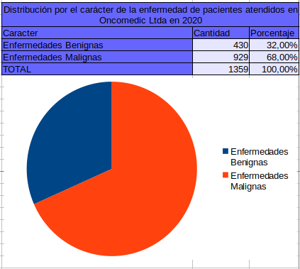 De los 1394 pacientes atendidos en 2021 540 es decir el 39% presentan patología benigna y 854 usuarios el 61% con patología maligna, estos resultados nos muestran un ligero incremento del número de pacientes con patología benigna dado que en 2020 929 es decir el 68% tenían enfermedades malignas y el restante 32% enfermedades benignas