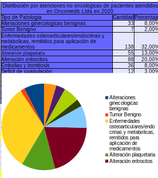 Cuando observamos la distribución de los pacientes que acuden por razones no oncologicas para la prestación del servicio encontramos que de los 430 casos 138 es decir el 32% corresponden a diversas patologías entre ellas las mas comunes osteoporosis o problemas reumáticos que fueron remitidos para aplicación de medicamentos, el 53% corresponden a patología hematológica benigna con un mayor porcentaje de anemias de diferentes tipos, el 2% corresponden a tumores benignos, el 8% lesiones benignas ginecologicas y el 5% eran paciente para manejo por oncología oral.